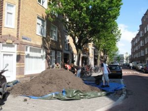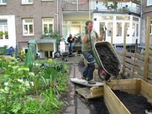 In towns and cities in the Netherlands, the houses are often built around courtyard gardens. Our visitors helped us to lug this soil through the house and out to the gardens, where they filled our twelve (large) raised beds